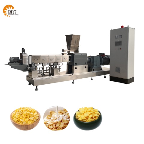 La linea di produzione di cereali per la colazione utilizza farina di mais, farina di frumento e altre farine diverse come materie prime, e la materia prima viene estrusa in più di alcune forme come la forma ad anello e piccole particelle tramite un estrusore, grande capacità, funziona in modo stabile!